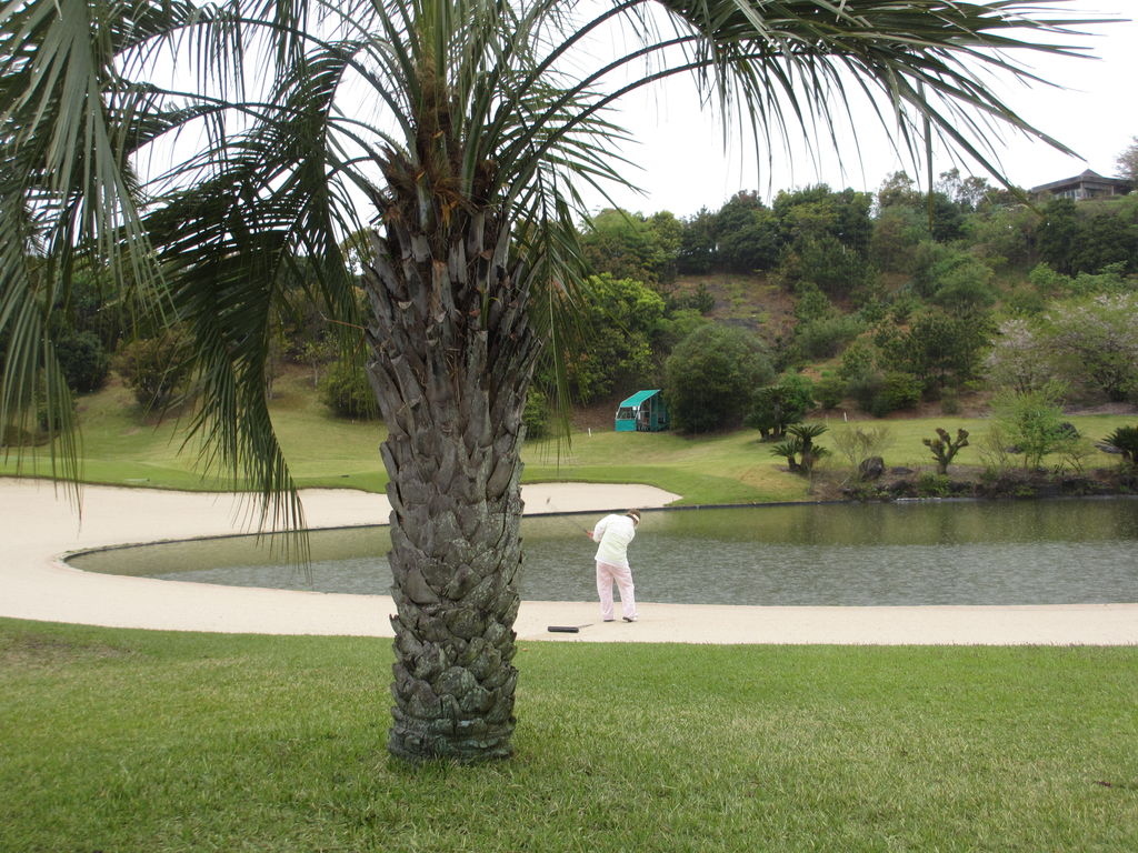 もう景色 抜群の 所で バンカーショットを打つ 神取忍先生です。