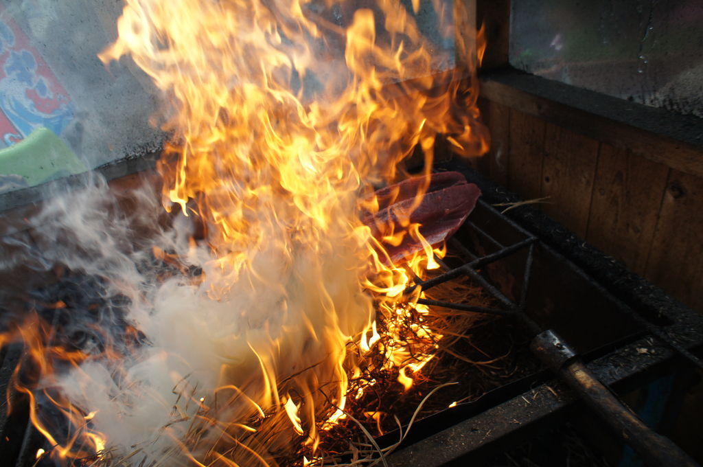 この脂カツオ刺身用をゆず庵社長生まれ故郷大豊村→今の大豊町のとっと山奥山の上から軽トラで運んできてゆず庵入り口で焼いてます❗️
