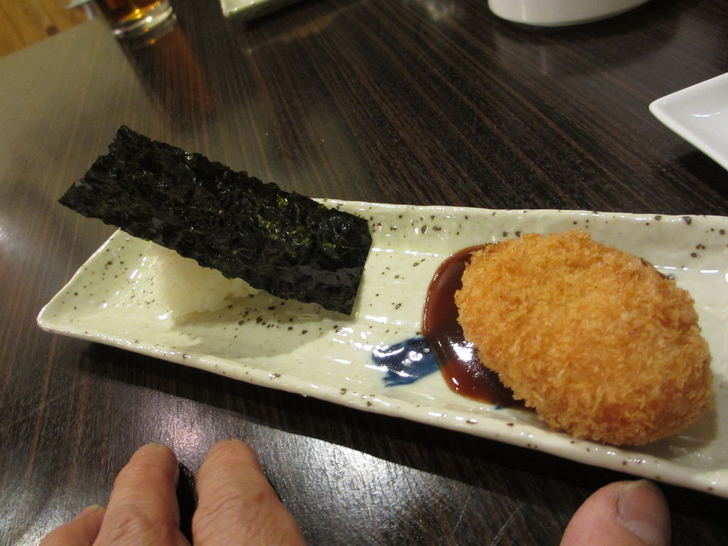 付き出しは おにぎりと コロッケ 酒のあてに おにぎりとは ナイス!!